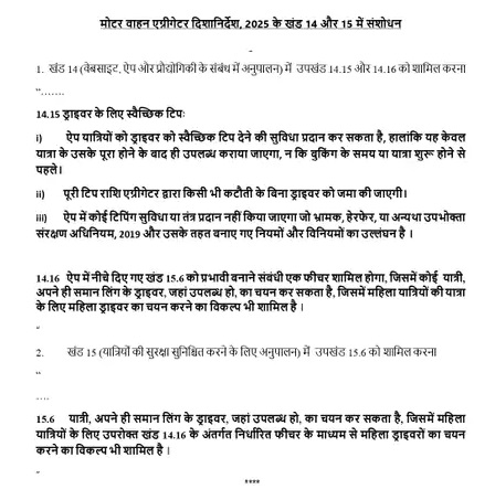 • एग्रीगेटर्स को अपना एप अपडेट करना होगा, जैसे क्लॉज 15.6 के तहत सेम जेंडर के ड्राइवर चुनने का फीचर जोड़ना।