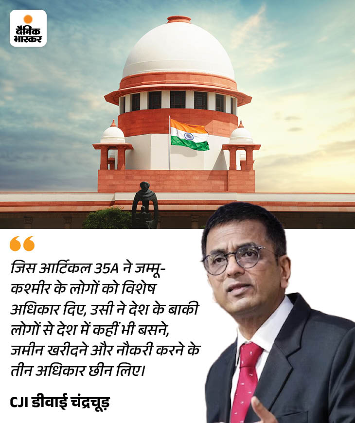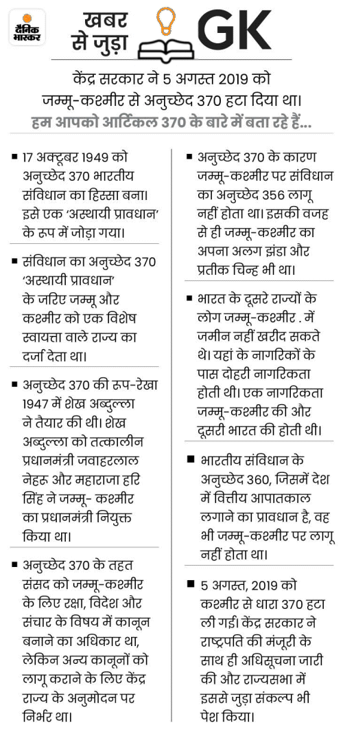 केंद्र सरकार ने 5 अगस्त 2019 को जम्मू-कश्मीर से आर्टिकल 370 हटाया था। साथ ही राज्य को 2 हिस्सों जम्मू-कश्मीर और लद्दाख के दो केंद्रशासित प्रदेशों में बांट दिया था। इसके खिलाफ सुप्रीम कोर्ट में 23 याचिकाएं दाखिल हुई थीं। 5 जजों की बेंच ने सभी याचिकाओं की एक साथ सुनवाई की थी।