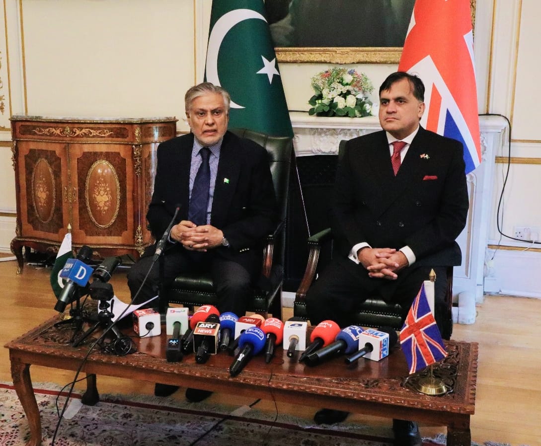 इशाक डार (बाएं) ने लंदन में पाकिस्तान हाई कमीशन में प्रेस ब्रीफिंग के दौरान भारत के साथ ट्रेड को लेकर चर्चा की थी।