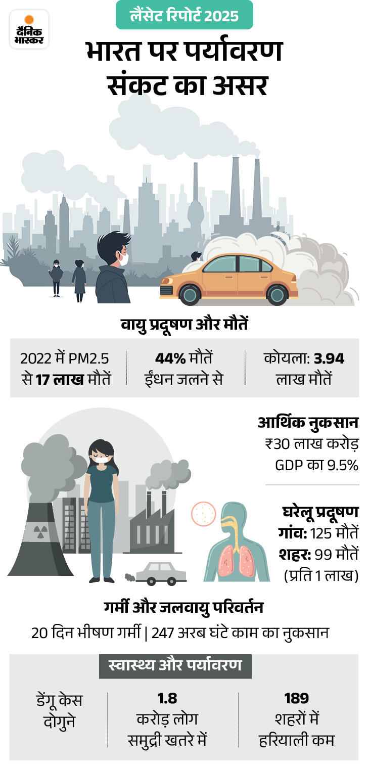 भारत में वायु प्रदूषण अब सिर्फ एक पर्यावरण की समस्या नहीं रह गई है, बल्कि यह लोगों की जान और देश की अर्थव्यवस्था दोनों के लिए बड़ा खतरा बन चुका है। अंतरराष्ट्रीय रिपोर्ट लैंसेट काउंटडाउन ऑन हेल्थ एंड क्लाइमेट चेंज ने 29 अक्टूबर 2025 को जारी रिपोर्ट में इसकी पुष्टि की थी।