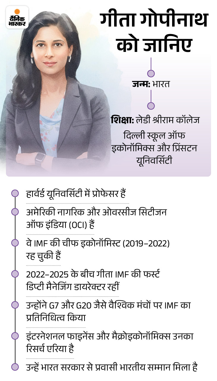 गीता गोपीनाथ भारतीय मूल की अमेरिकी अर्थशास्त्री हैं। वें IMF की पहली डिप्टी मैनेजिंग डायरेक्टर रह चुकीं हैं।