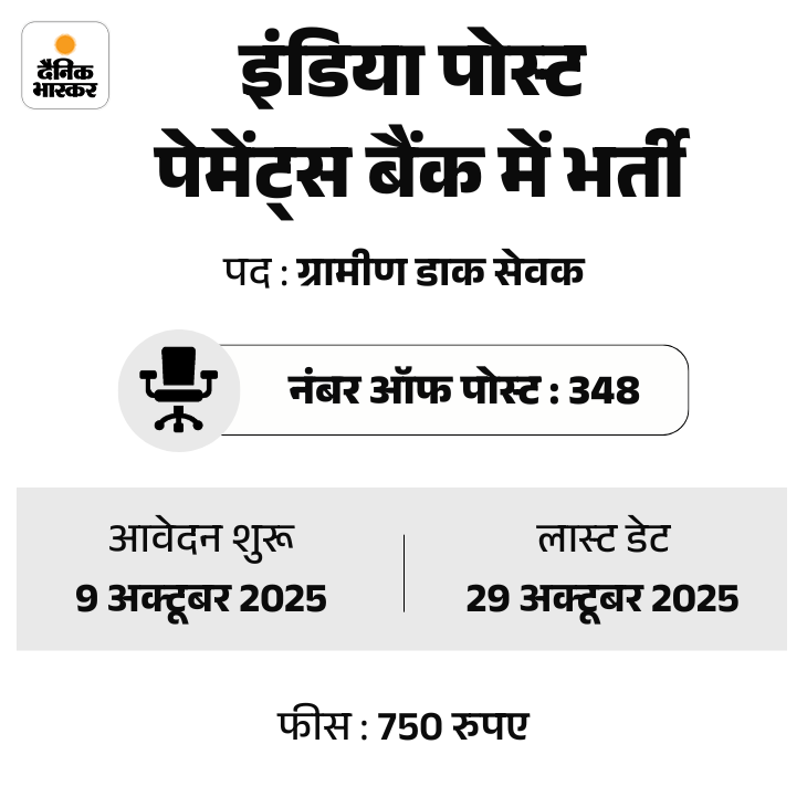 इंडिया पोस्ट पेमेंट बैंक की ओर से ग्रामीण डाक सेवक के पदों पर भर्ती निकली है। इस भर्ती के लिए आवेदन का आज आखिरी दिन है। उम्मीदवार IPPB की ऑफिशियल वेबसाइट ippbonline.com पर जाकर अप्लाई कर सकते हैं। यह भर्ती 1 साल के लिए की जाएगी जिसे 1 साल और आगे बढ़ाया जा सकता है।
