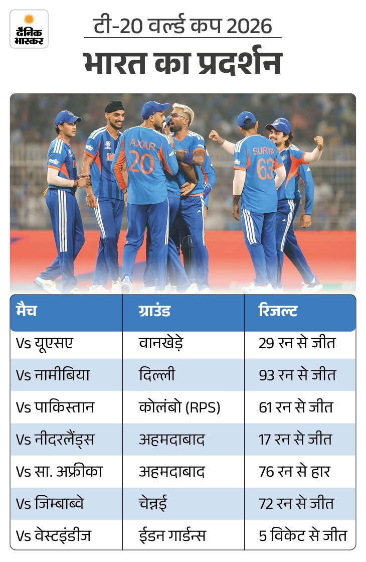 टी-20 वर्ल्ड कप 2026 में भारत ने लीग स्टेज और सुपर-8 मिलाकर सात मैच खेले हैं, जिनमें से छह जीते। ग्रुप स्टेज में अमेरिका, नामीबिया, पाकिस्तान और नीदरलैंड को हराया।