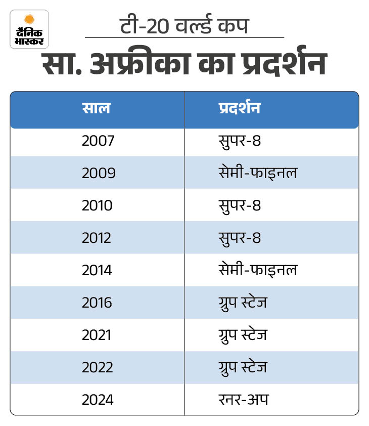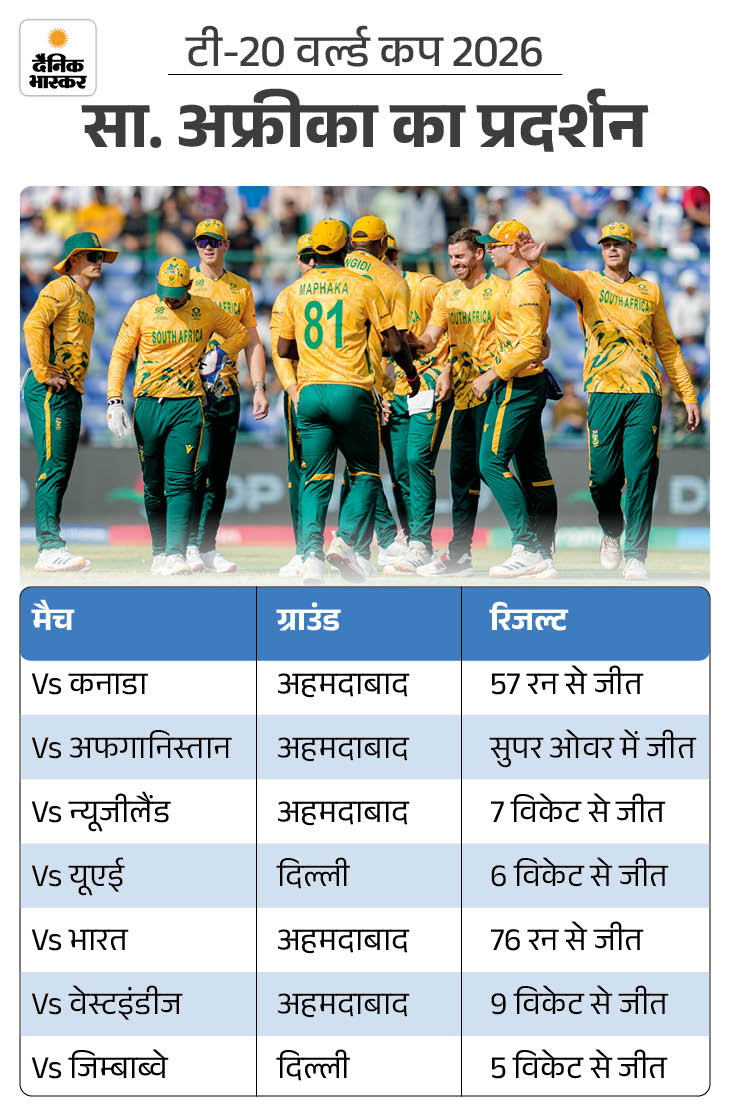 इस एडिशन में साउथ अफ्रीका ने अब तक सातों मैच जीते हैं। ग्रुप स्टेज में कनाडा, अफगानिस्तान, न्यूजीलैंड और यूएई को हराया। सुपर-8 में भारत, वेस्टइंडीज और जिम्बाब्वे पर जीत दर्ज कर टेबल टॉपर बनी। अगर 4 मार्च को न्यूजीलैंड के खिलाफ जीत मिलती है, तो टीम लगातार दूसरे फाइनल में पहुंचेगी, जो उसके इतिहास में पहली बार होगा।