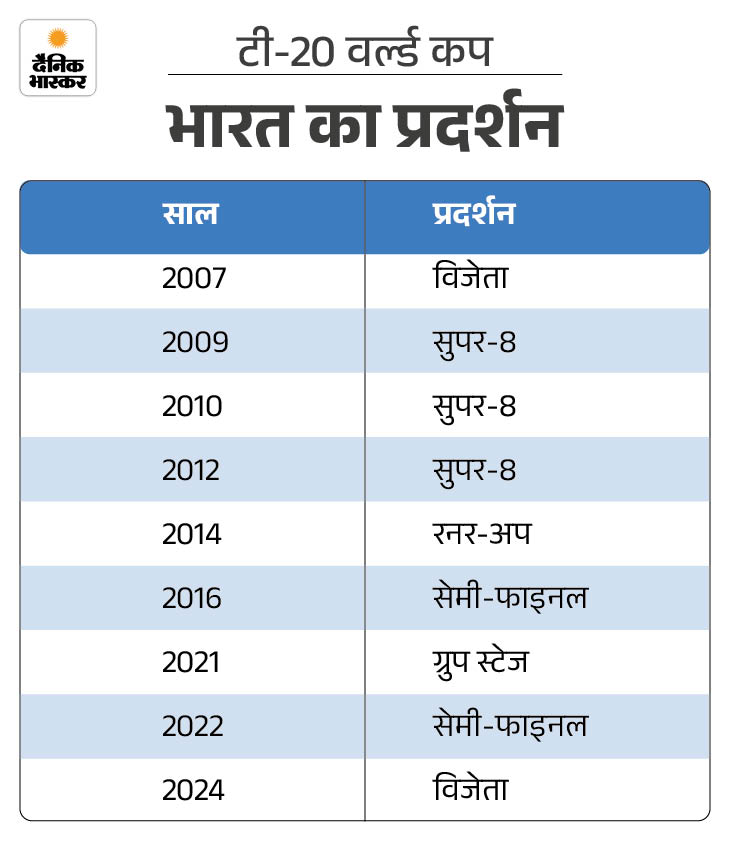 भारत टी-20 वर्ल्ड कप में दो बार खिताब जीत चुका है। 2007 में महेंद्र सिंह धोनी की कप्तानी में टीम ने फाइनल में पाकिस्तान को हराकर पहला एडिशन अपने नाम किया था। इसके बाद 2009, 2010 और 2012 में टीम सुपर-8 तक ही पहुंच सकी।