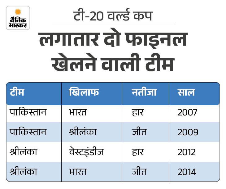 टी-20 वर्ल्ड कप की शुरुआत 2007 में हुई थी। तब से अब तक केवल दो टीमों ने लगातार दो एडिशन के फाइनल में जगह बनाई है। पाकिस्तान ने 2007 और 2009 में लगातार फाइनल खेला, जबकि श्रीलंका 2012 और 2014 में बैक-टू-बैक खिताबी मुकाबले तक पहुंचा।