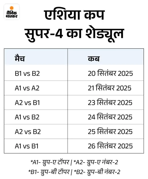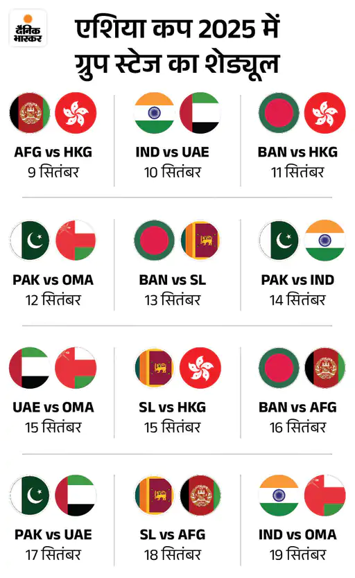 एशिया कप में तीन बार भारत-पाक के भिड़ने की उम्मीद एशिया कप में भारत-पाक एक ही ग्रुप में है। दोनों के ग्रुप लीग मैच 14 सितंबर के अलावा भी टूर्नामेंट में दो बार और भिड़ने की उम्मीद है। भारत और पाकिस्तान ने अगर सुपर-4 स्टेज में जगह बनाई तो दोनों टीमें फिर एक बार 21 सितंबर को आमने-सामने होंगी। टूर्नामेंट का फाइनल 28 सितंबर को खेला जाएगा। भारत और पाकिस्तान ने सुपर-4 स्टेज में टॉप किया तो दोनों के बीच टूर्नामेंट में तीसरा मुकाबला भी हो सकता है।