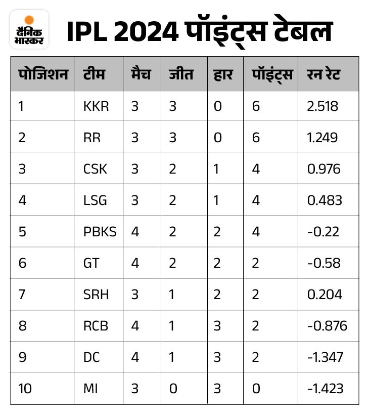 इंडियन प्रीमियर लीग (IPL) 2024 में 17 मुकाबले खेले जा चुके हैं। गुरुवार को पंजाब किंग्स (PBKS) ने इस सीजन के 17वें मुकाबले में गुजरात टाइटंस (GT) को 3 विकेट से हराया। मौजूदा सीजन में पंजाब की दूसरी जीत है। इस जित से पंजाब को पॉइंट्स टेबल में फायदा मिला, टीम सातवें से पांचवें नंबर पर आ गई है। वहीं गुजरात छठे नंबर पर आ गई है।