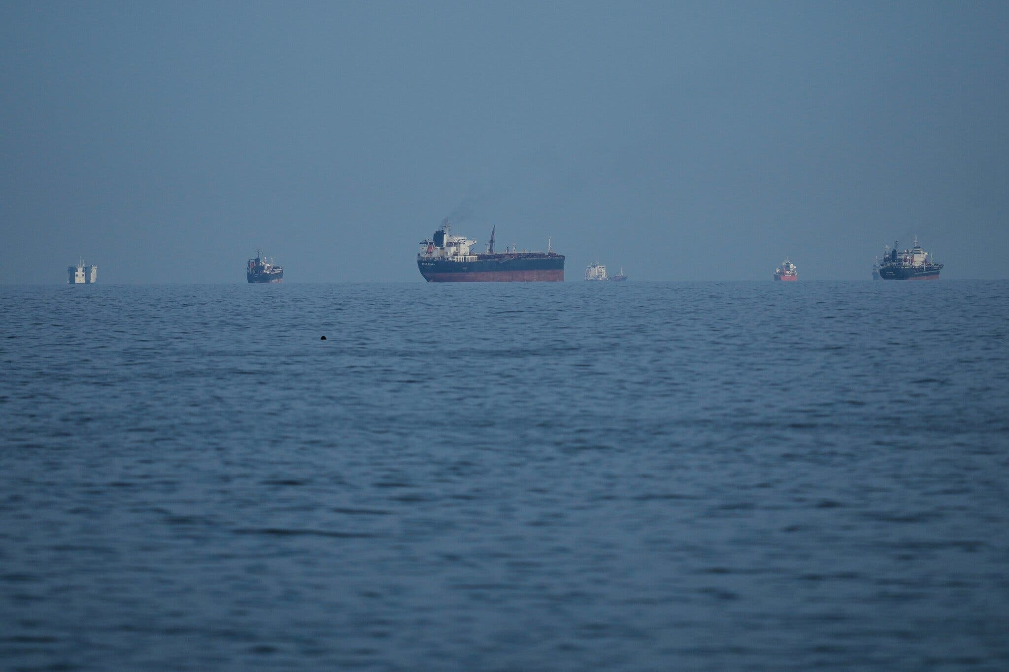 इस महीने UAE के मीना अल फजेर से दिख रहे होर्मुज जलडमरूमध्य में तेल टैंकर और मालवाहक जहाज।