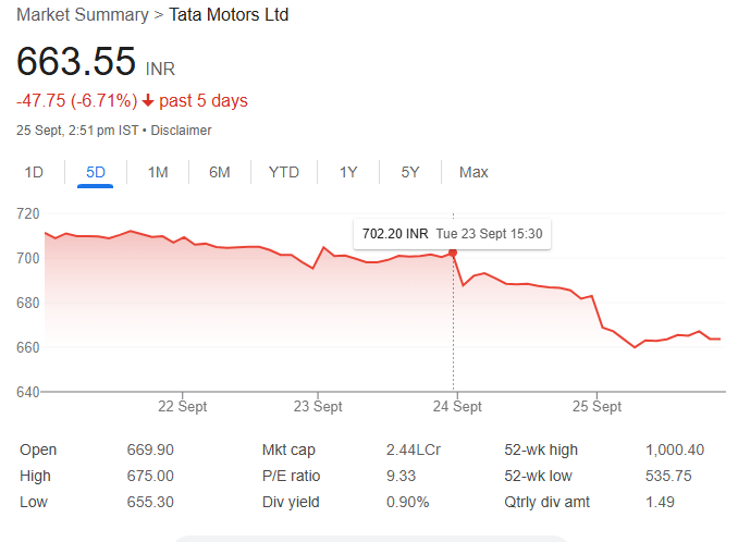 इसी वजह से आज यानी, 25 सिंतबर को टाटा मोटर्स के शेयरों में 2% से ज्यादा कि गिरावट है। कंपनी के शेयर आज 18 रुपए या 2.64% गिरकर 664.90 रुपए पर बंद हुए।