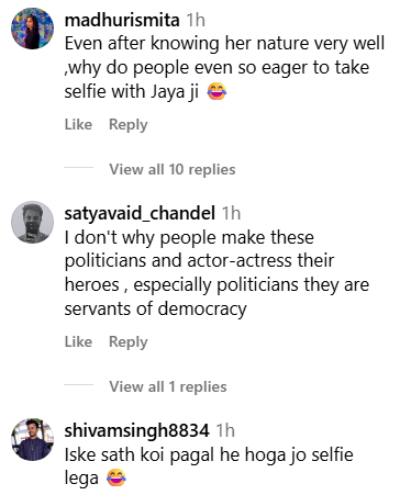 सोशल मीडिया पर अब यूजर्स जया बच्चन की हरकत की आलोचना कर रहे हैं। एक यूजर ने लिखा- ‘अमिताभ बच्चन नोबेल प्राइज डिजर्व करते हैं।’ एक यूजर लिखती हैं- ‘जया जी का स्वभाव अच्छी तरह से जानने के बाद भी लोग उनके साथ सेल्फी लेने के लिए इतने उत्सुक क्यों रहते हैं?’