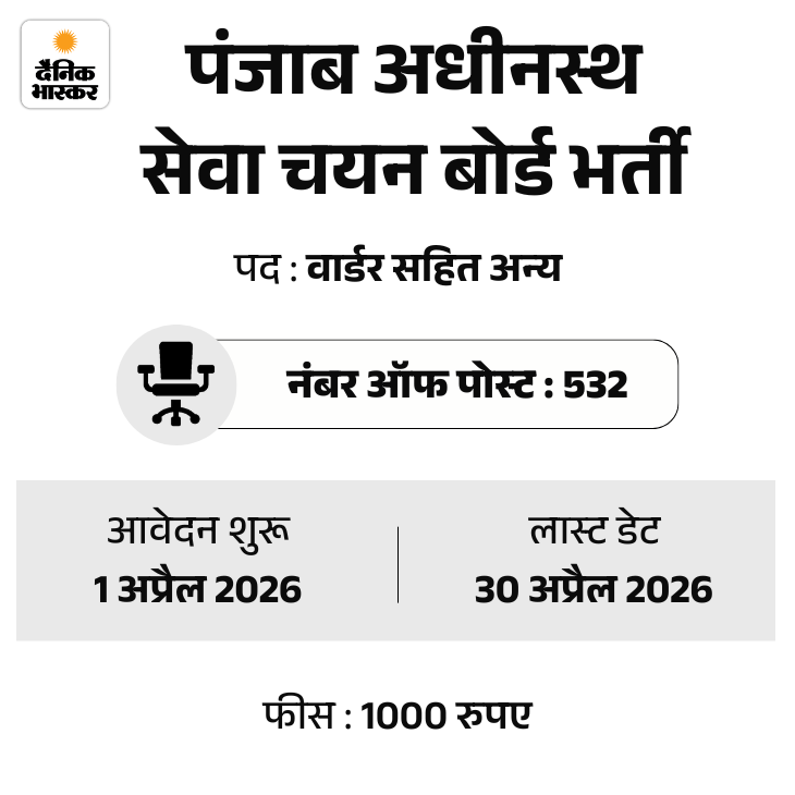 पंजाब अधीनस्थ सेवा चयन बोर्ड ने 532 पदों पर भर्ती निकाली है। इस भर्ती के लिए आवेदन की शुरुआत 1 अप्रैल 2026 से होगी। उम्मीदवार ऑफिशियल वेबसाइट पर जाकर अप्लाई कर सकेंगे। फीस जमा करने की आखिरी तारीख 30 अप्रैल तय की गई है।