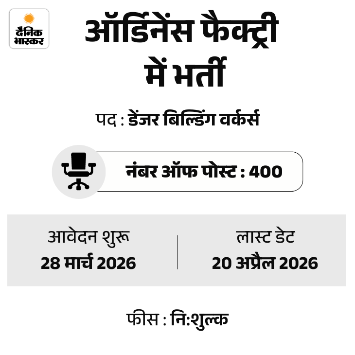 ऑर्डिनेंस फैक्ट्री, चंदा (महाराष्ट्र) में डेंजर बिल्डिंग वर्कर्स के 400 पदों पर भर्ती निकली है। मुनिशन्स इंडिया लिमिटेड ने इस भर्ती के लिए नोटिफिकेशन जारी किया है। उम्मीदवार ऑफलाइन माध्यम से आवेदन कर सकते हैं। इस भर्ती का विज्ञापन 28 से 3 अप्रैल 2026 के रोजगार समाचार में प्रकाशित किया गया है।