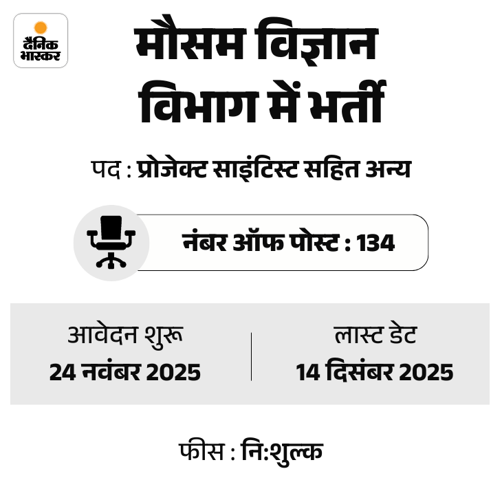 भारत मौसम विज्ञान विभाग में प्रोजेक्ट साइंटिस्ट, साइंटिफिक असिस्टेंट और एडमिनिस्ट्रेटिव असिस्टेंट पदों पर भर्ती निकली है। ​​​​​​​50 साल तक के पोस्‍ट ग्रेजुएट्स 14 दिसंबर तक इसके लिए आवेदन कर सकते हैं।
