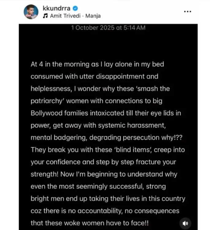 एक्टर ने आगे लिखा कि उन्होंने यह नोट सुबह चार लिखा था। उन्होंने कहा कि कुछ महिलाएं, जिनके बॉलीवुड परिवारों से संबंध होते हैं, किसी भी पुरुष पर बिना पछतावे के आरोप लगा सकती हैं और कोई उनसे सवाल तक नहीं करता। करण ने इसे सिस्टमेटिक हैरेसमेंट बताया और कहा कि ऐसे झूठे आरोप किसी इंसान को अंदर से तोड़ देते हैं।