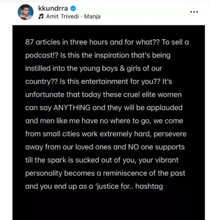 करण कुंद्रा ने अपने इंस्टाग्राम पर लिखा, करीब तीन घंटे में 87 आर्टिकल्स और वो भी किस लिए? सिर्फ एक पॉडकास्ट बेचने के लिए? क्या यही वह प्रेरणा है जो हम अपने देश के युवाओं को दे रहे हैं? क्या यही आज का एंटरटेनमेंट है? दुर्भाग्यपूर्ण है कि आज कुछ निर्दयी, तथाकथित एलीट महिलाएं कुछ भी बोल देती हैं और उन्हें सराहा जाता है। और हम जैसे पुरुष जो छोटे शहरों से आते हैं, बेहद मेहनत करते हैं, अपनों से दूर रहकर संघर्ष करते हैं उनके लिए कोई जगह नहीं बचती। कोई तब तक साथ नहीं देता जब तक कि आप पूरी तरह से टूट न जाएं, जब तक कि आपकी आखिरी चिंगारी भी बुझ न जाए।