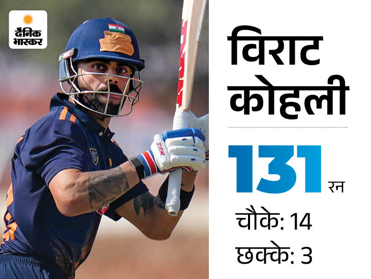 विराट कोहली ने विजय हजारे 2025-26 में अब तक दो मैच खेले हैं। उन्होंने पहले मैच में 131 और दूसरे में 77 रन बनाए।