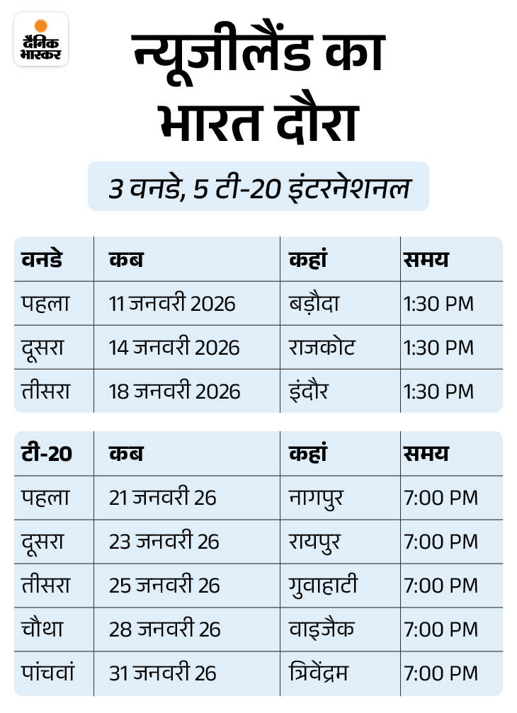 न्यूजीलैंड के खिलाफ वनडे सीरीज BCCI सूत्रों के अनुसार न्यूजीलैंड के खिलाफ वनडे सीरीज के लिए भारतीय टीम 8 जनवरी तक वडोदरा में जुटेगी। संभावना है कि कोहली एक दिन पहले पहुंचकर अभ्यास कर सकते हैं। तीन मैचों की वनडे सीरीज 11 जनवरी से शुरू होगी।
