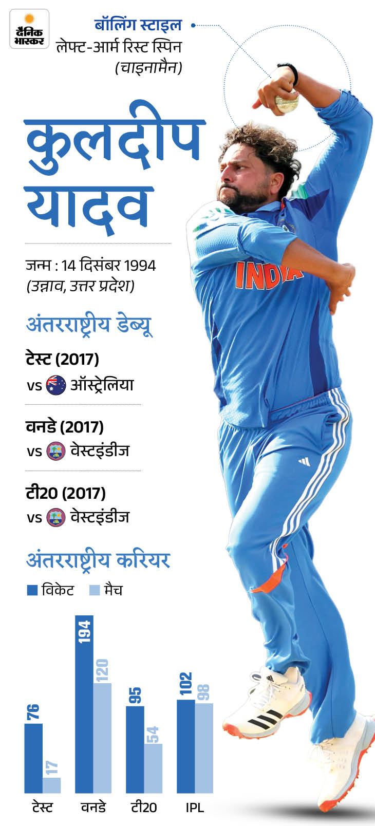भारतीय क्रिकेट टीम के स्टार स्पिनर कुलदीप यादव जल्द ही अपनी जिंदगी की नई पारी शुरू करने जा रहे हैं। कुलदीप अपनी मंगेतर और बचपन की दोस्त वंशिका सिंह के साथ 14 मार्च 2026 को शादी के बंधन में बंधेंगे। (पढ़ें पूरी खबर)