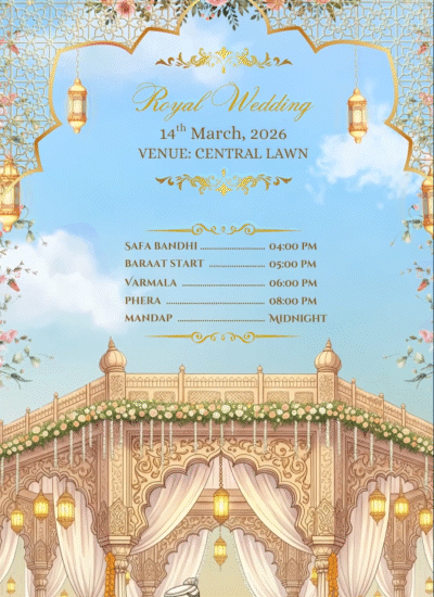 कार्ड के ऊपरी हिस्से पर गोल्डन लॉक और गुलाबी फूलों की डिजाइन भी बनाई गई है। वहीं बीच में एक आकर्षक चित्र उकेरा गया है, जिसमें महल के झरोखे के सामने एक शाही जोड़ा खड़ा दिखाई देता है।