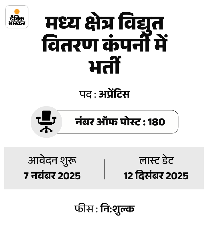 मध्य क्षेत्र विद्युत वितरण कंपनी लिमिटेड (MPMKVVCL) की ओर से अप्रेंटिसशिप की भर्ती निकली है। उम्मीदवार ऑफिशियल वेबसाइट portal.mpcz.in पर जाकर अप्लाई कर सकते हैं। अप्रेंटिसशिप की ट्रेनिंग एक साल के लिए की जाएगी।