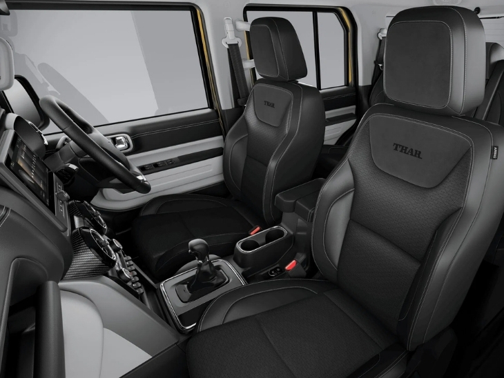 थार रॉक्स के रेगुलर मॉडल में लाइट कलर थीम में इंटीरियर मिलता है, लेकिन स्टार एडिशन में पूरी तरह से ब्लैक थीम दी गई है। इसमें ब्लैक लेदरेट अपहोल्स्ट्री के साथ स्वेड एक्सेंट्स दिए गए हैं, जो केबिन को स्पोर्टी और प्रीमियम फील देते हैं। डैशबोर्ड का लेआउट वही है, जो AX7L ट्रिम में मिलता है।