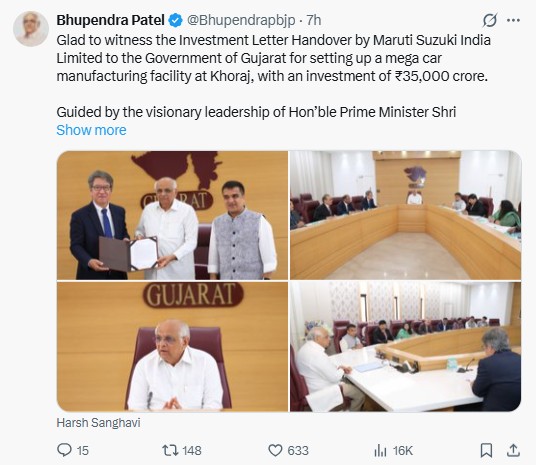 देश की सबसे बड़ी कार कंपनी मारुति सुजुकी अब गुजरात में अपनी मौजूदगी और ज्यादा बढ़ाने जा रही है। कंपनी ने राज्य के खोराज (गांधीनगर जिला) में एक नया मैन्युफैक्चरिंग प्लांट लगाने के लिए गुजरात सरकार के साथ ₹35,000 करोड़ के निवेश का करार किया है।