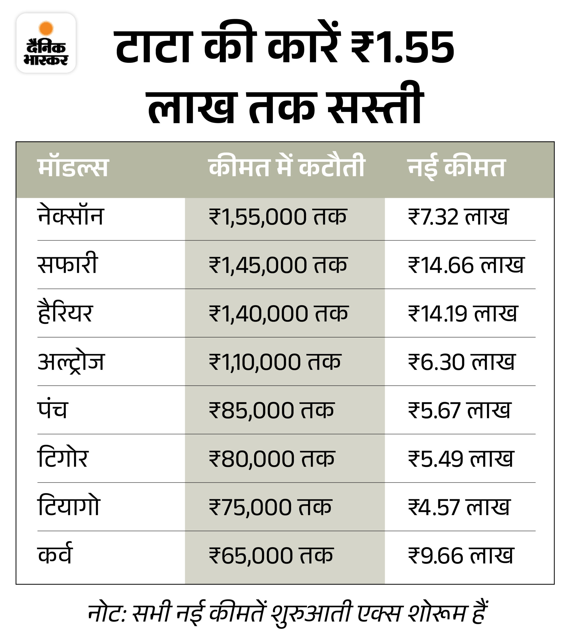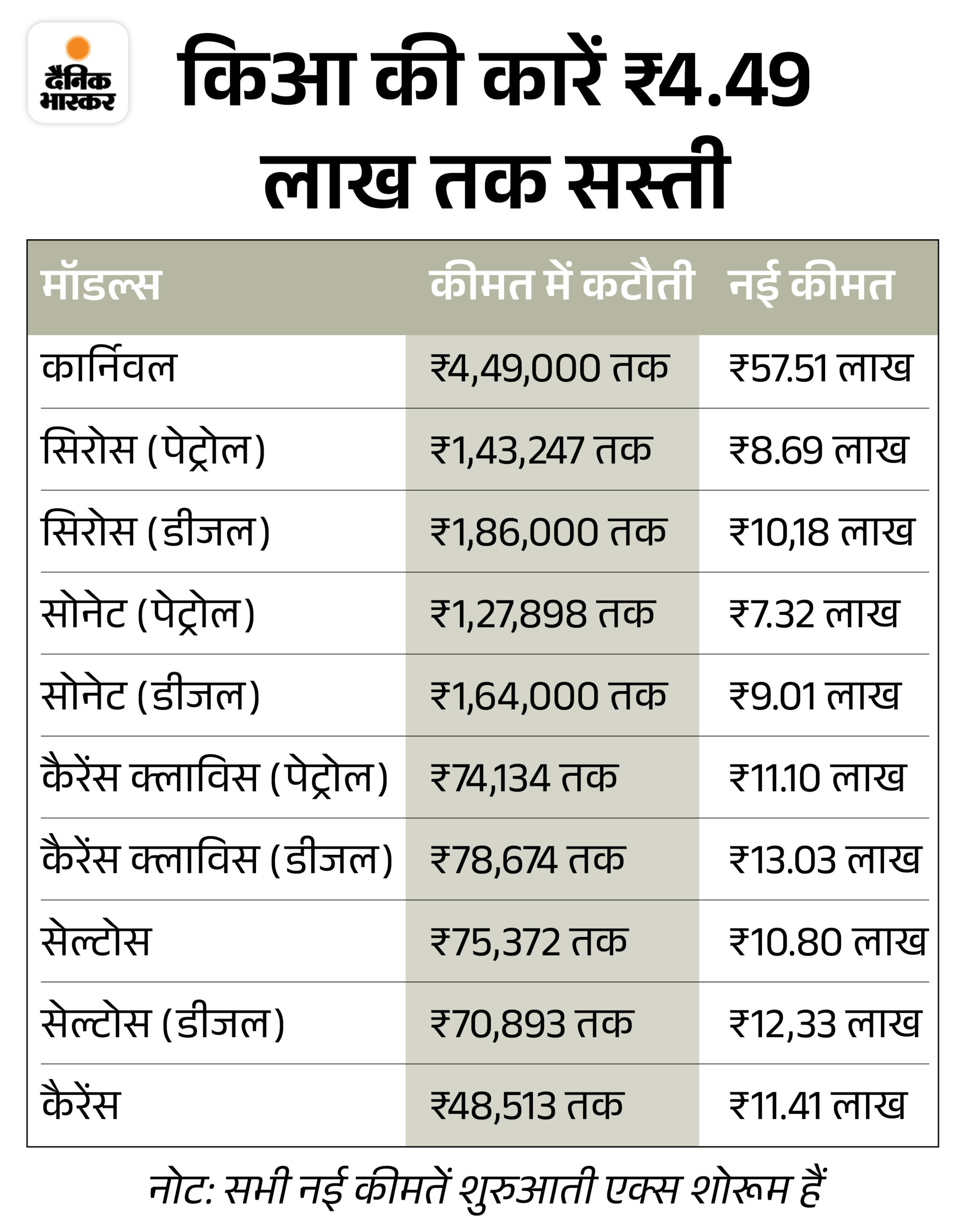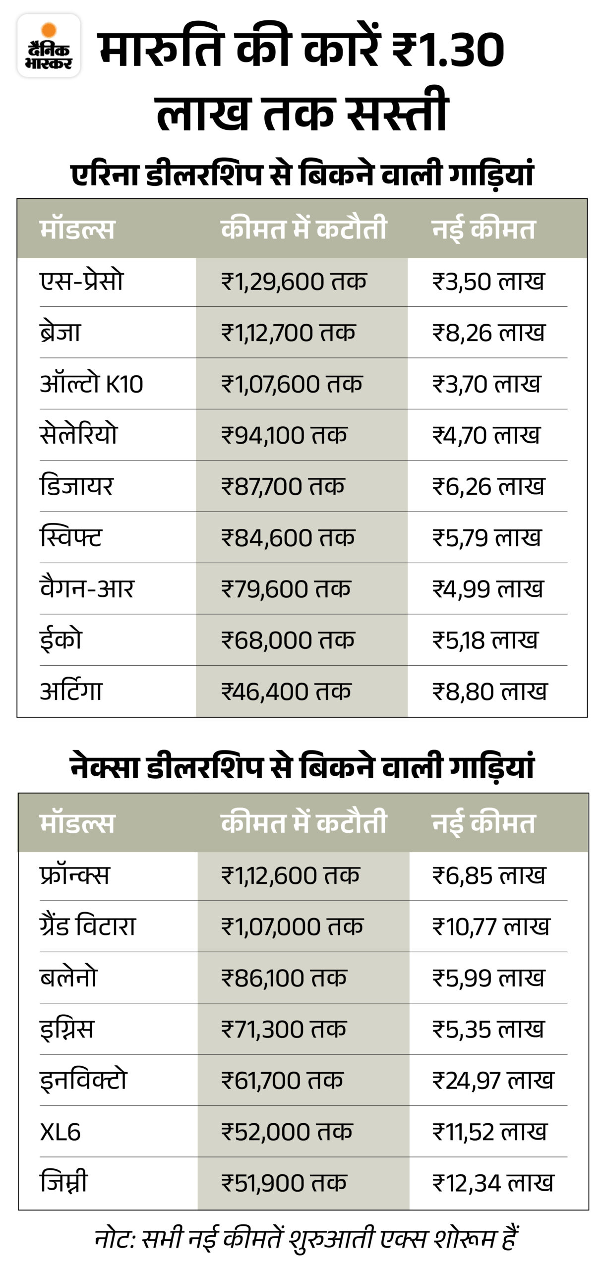 ऐसे में मारुति स्विफ्ट, वैगनार, ऑल्टो, टाटा टियागो और हुंडई i10, किआ सिरोस जैसी फैमिली कारें अब 10-15% यानी 70 हजार से 4.49 लाख रुपए तक सस्ती हो गई हैं। तो आइए ग्राफिक्स में जानते हैं कौन सी कर कितने रुपए तक सस्ती हुई।