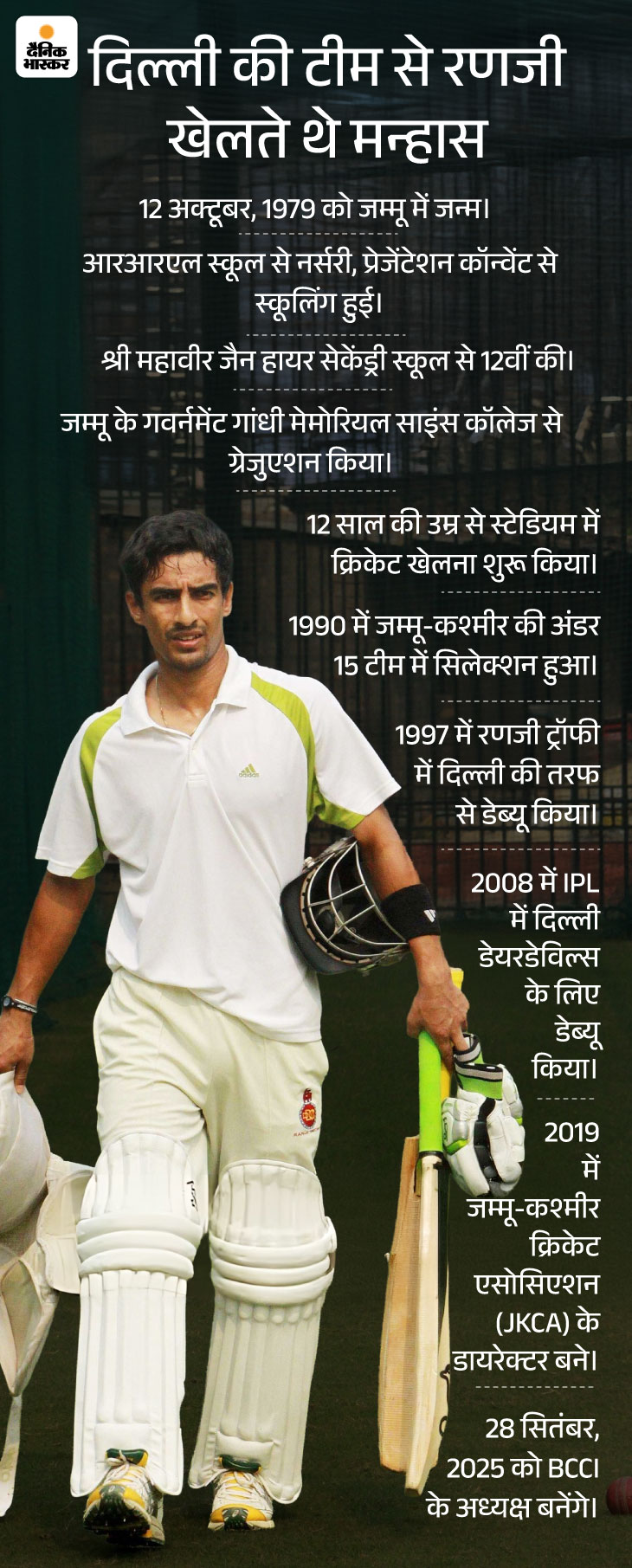 मिथुन मन्हास दुनिया की सबसे शक्तिशाली क्रिकेट बोर्ड का नेतृत्व करने वाले पहले अनकैप्ड क्रिकेटर बनकर इतिहास रचेगें। उन्होंने रविवार, 21 सितंबर को BCCI के अध्यक्ष पद के लिए अपना नामांकन दाखिल किया था।