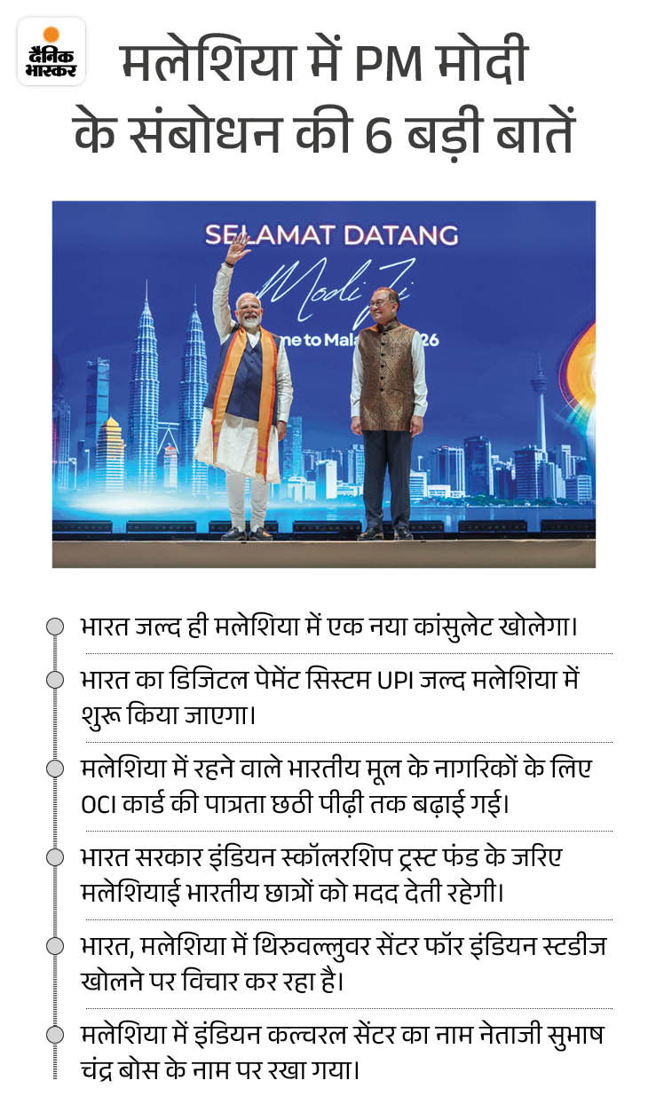प्रधानमंत्री ने कहा कि भारत-मलेशिया संबंध लगातार मजबूत हो रहे हैं और जल्द ही भारत का UPI सिस्टम मलेशिया में शुरू होगा। उन्होंने भरोसा दिलाया कि भारत अपने प्रवासी भारतीयों के साथ हमेशा खड़ा रहेगा और 2047 तक विकसित भारत के लक्ष्य में उनकी अहम भूमिका है।