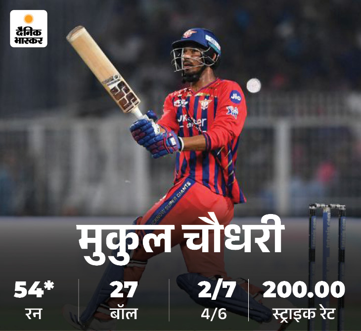 LSG को आखिरी 18 बॉल पर 43 रन चाहिए थे और 7 विकेट गिर चुके थे। ऐसे में मुकुल चौधरी ने 27 बॉल पर नाबाद 54 रन बनाकर टीम को हारा हुआ मैच जिता दिया।