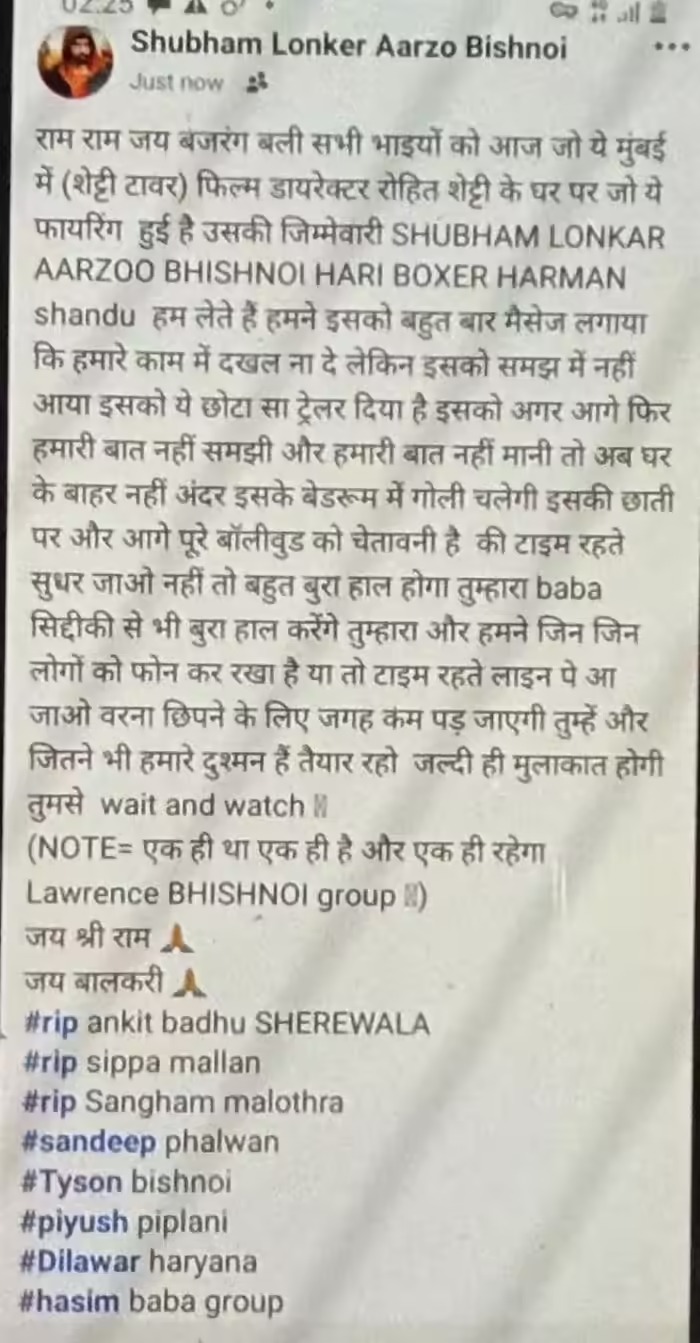 सभी भाइयों को आज जो ये मुंबई में (शेट्टी टावर) फिल्म डायरेक्टर रोहित शेट्टी के घर पर फायरिंग हुई है, उसकी जिम्मेदारी शुभम लोनकर, आरजू बिश्नोई, हरि बॉक्सर, हरमन संधू हम लेते हैं। हमने इसको बहुत बार मैसेज लगाया कि हमारे काम में दखल ना दे, लेकिन इसको समझ में नहीं आया। इसको ये छोटा सा ट्रेलर दिया है। अगर इसने आगे फिर हमारी बात नहीं समझी और हमारी बात नहीं मानी, तो अब घर के बाहर नहीं, अंदर इसके बेडरूम में गोली चलेगी, इसकी छाती पर।