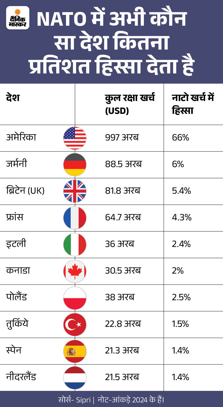 पिछले साल नीदरलैंड्स के द हेग शहर में हुई NATO समिट के बाद ट्रम्प ने यूरोपीय देशों से रक्षा खर्च बढ़ाने को कहा था। ट्रम्प का मानना है कि अमेरिका NATO को बहुत पैसा देता है, लेकिन बाकी देश अपनी जिम्मेदारी ठीक से नहीं निभा रहे हैं।