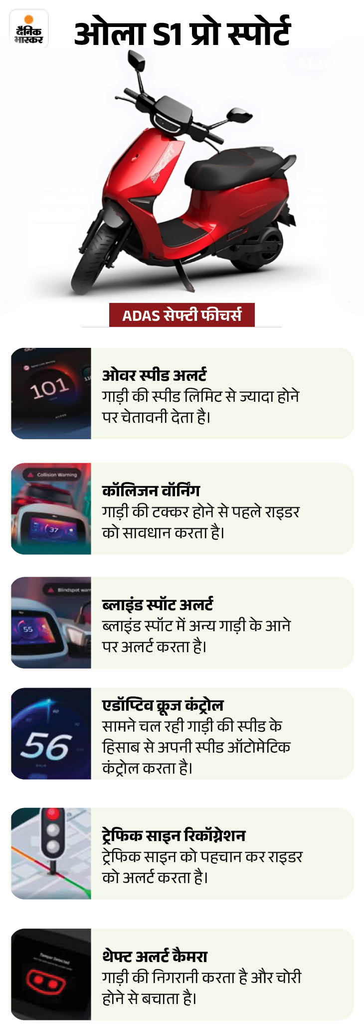 ओला इलेक्ट्रिक ने आज (15 अगस्त) भारतीय बाजार में नया इलेक्ट्रिक स्कूटर ओला S1 प्रो स्पोर्ट लॉन्च किया है। ये भारत में पहला इलेक्ट्रिक स्कूटर है, जिसमें सेफ्टी के लिए कार में मिलने वाले ADAS (एडवांस ड्राइवर असिस्टेंस सिस्टम) फीचर्स दिए गए हैं। इसमें ओवर स्पीड अलर्ट, कॉलिजन वॉर्निंग, ब्लाइंड स्पॉट अलर्ट, एडॉप्टिव क्रूज कंट्रोल, ट्रेफिक साइन रिकॉग्नेशन और थेफ्ट अलर्ट कैमरा शामिल है।