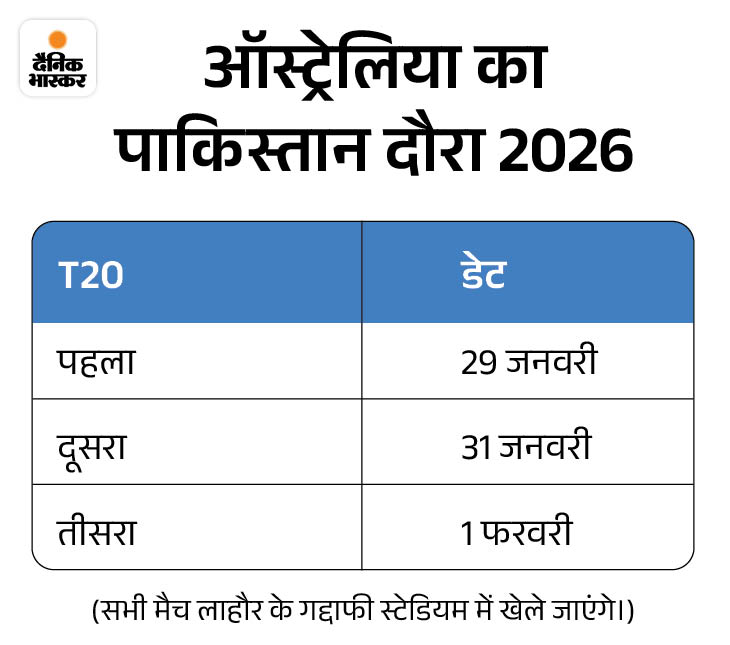 ऑस्ट्रेलिया के खिलाफ वर्ल्डकप की तैयारी करेगी PAK वर्ल्ड कप से पहले पाकिस्तान टीम ऑस्ट्रेलिया के खिलाफ तीन मैचों की T20I सीरीज खेलेगी। यह सीरीज गद्दाफी स्टेडियम, लाहौर में 29 और 31 जनवरी तथा 1 फरवरी को खेली जाएगी। टीम का तैयारी कैंप आज से शुरू हो रहा है।