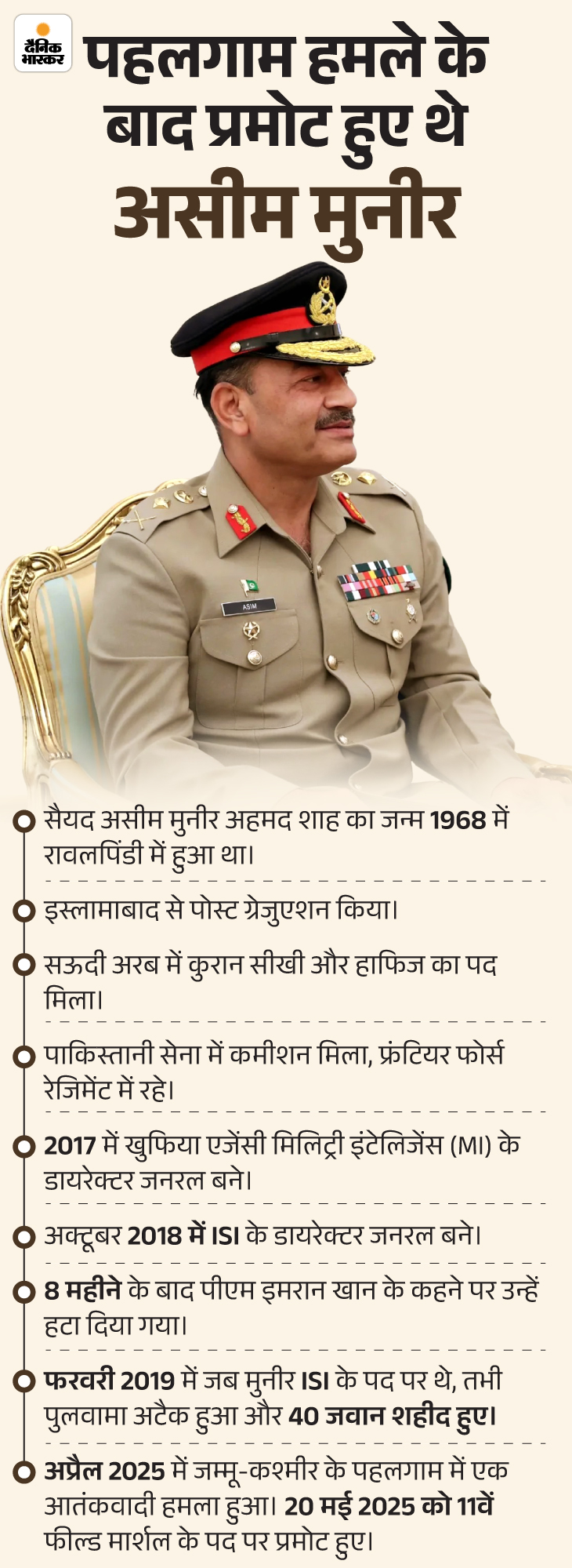 अप्रैल 2025 में हुए पहलगाम हमले के बाद पाकिस्तान कैबिनेट ने जनरल आसिम मुनीर को फील्ड मार्शल बनाने का प्रस्ताव दिया और उसको मंजूरी भी दी। जनरल आसिम मुनीर पाकिस्तान के इतिहास में दूसरे फील्ड मार्शल हैं। 1959-1967 के बीच अयूब खान इस पद पर रहे।