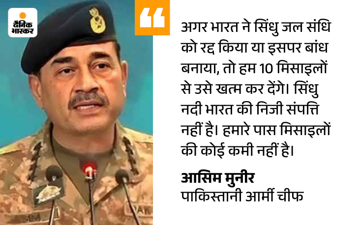 आसिम मुनीर ने कहा था, ‘भारत के सिंधु जल समझौता रद्द करने के फैसले से 25 करोड़ लोगों के लिए भुखमरी का खतरा पैदा हो सकता है।’ उन्होंने कहा, ‘हम एक परमाणु संपन्न राष्ट्र हैं और अगर हमें लगता है कि हम डूब रहे हैं, तो हम आधी दुनिया को अपने साथ ले जाएंगे।
