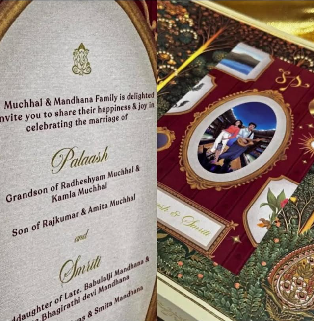 अंदर मुच्छल और मंधाना फैमिली का निमंत्रण मैसेज दिख रहा। साथ ही वर-वधु में पलाश और स्मृति का नाम नजर आ रहा है। फैन अकाउंट के मुताबिक, दोनों इसी महीने के 20 तारीख को शादी के बंधन में बंध जाएंगे।