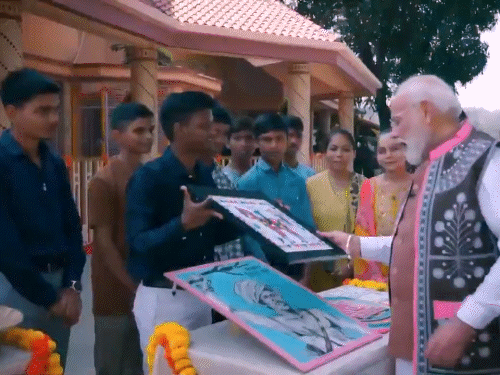 तस्वीर में पीएम मोदी छात्रों की बनाई पेंटिंग्स देखते नजर आ रहे हैं।