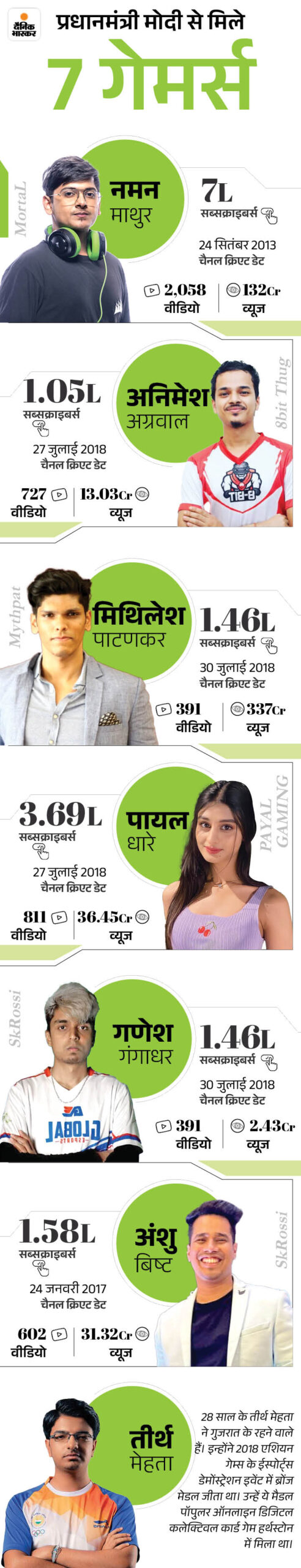 प्रधानमंत्री नरेंद्र मोदी ने गेमिंग इंडस्ट्री के 7 क्रिएटर्स से मुलाकात की और उनसे गेमिंग से जुड़े कई मुद्दों पर बात की। इन 7 गेमर्स में नमन माथुर, अनिमेश अग्रवाल, मिथिलेश पाटणकर, पायद धारे, अंशु बिष्ट, तीर्थ महेता और गणेश गंगाधर शामिल हैं।