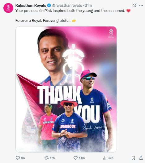 RR की फ्रेंचाइजी ने इस पोस्ट के साथ द्रविड़ से अलग होने का ऐलान किया…