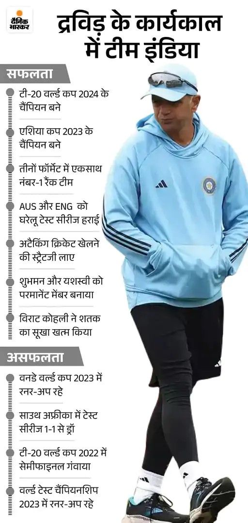 - 2023 में वनडे वर्ल्ड कप के बाद द्रविड़ का कार्यकाल खत्म हो गया था, लेकिन टीम इंडिया के फाइनल में पहुंचने के कारण उनका कार्यकाल टी-20 वर्ल्ड कप तक बढ़ा दिया गया था। फिर द्रविड़ ने भारत को टी-20 में वर्ल्ड चैंपियन बना दिया। 29 जून को भारत ने साउथ अफ्रीका को 7 रन से हराते हुए टी-20 वर्ल्ड कप जीता।