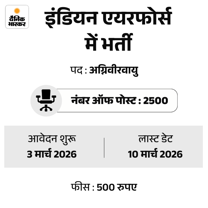 इंडियन एयरफोर्स में अग्निवीर वायु INTAKE 01/27 के लिए आवेदन की आखिरी तारीख करीब है। उम्मीदवार ऑफिशियल वेबसाइट iafrecruitment.edcil.co.in पर जाकर आवेदन कर सकते हैं। इस भर्ती के लिए रिटन एग्जाम 30-31 मार्च 2026 को होगा।
