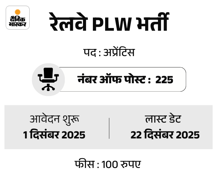 Railway Patiala Locomotive Works Recruitment for 225 Posts; Opportunity for 8th to 10th Pass, Fee Rs. 100 | सरकारी नौकरी: रेलवे पटियाला लोकोमोटिव वर्क्स में 225 पदों पर भर्ती; 8वीं से लेकर 10वीं पास को मौका, फीस 100 रुपए