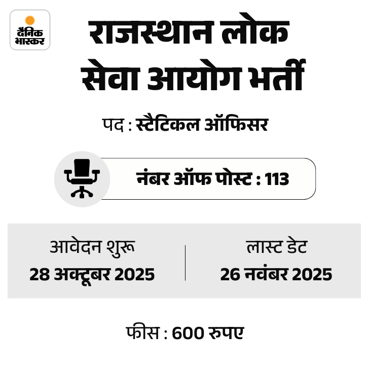 राजस्थान लोक सेवा आयोग (RPSC) ने स्टैटिकल ऑफिसर के पदों पर भर्ती निकाली है। उम्मीदवार RPSC की ऑफिशियल वेबसाइट rpsc.rajasthan.gov.in पर जाकर आवेदन कर सकते हैं।