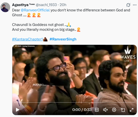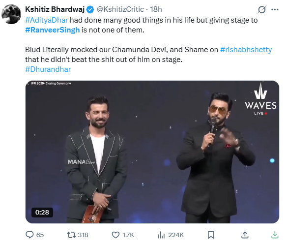 एक यूजर ने रणवीर की आलोचना करते हुए लिखा है, आदित्य धर (धुरंधर डायरेक्टर) ने अपनी जिंदगी में बहुत सी अच्छी चीजें की हैं, लेकिन रणवीर सिंह को मंच पर आने देना, उनमें से एक नहीं है। उसने चामुंडा देवी का मजाक उड़ाया और ऋषभ शेट्टी को शर्म आनी चाहिए कि उन्होंने इसे मंच पर पीटा नहीं।