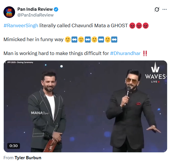 फिल्म फेस्टिवल से रणवीर सिंह का वीडियो सामने आने के बाद लोग उनकी जमकर आलोचना कर रहे हैं। एक यूजर ने लिखा है, रणवीर सिंह ने वाकई चावुंडी माता को भूत कहा है। मजाकिया अंदाज में मिमिकरी की है। वो धुरंधर के लिए मुश्किल खड़ी करने के लिए काफी कड़ी मेहनत कर रहे हैं।