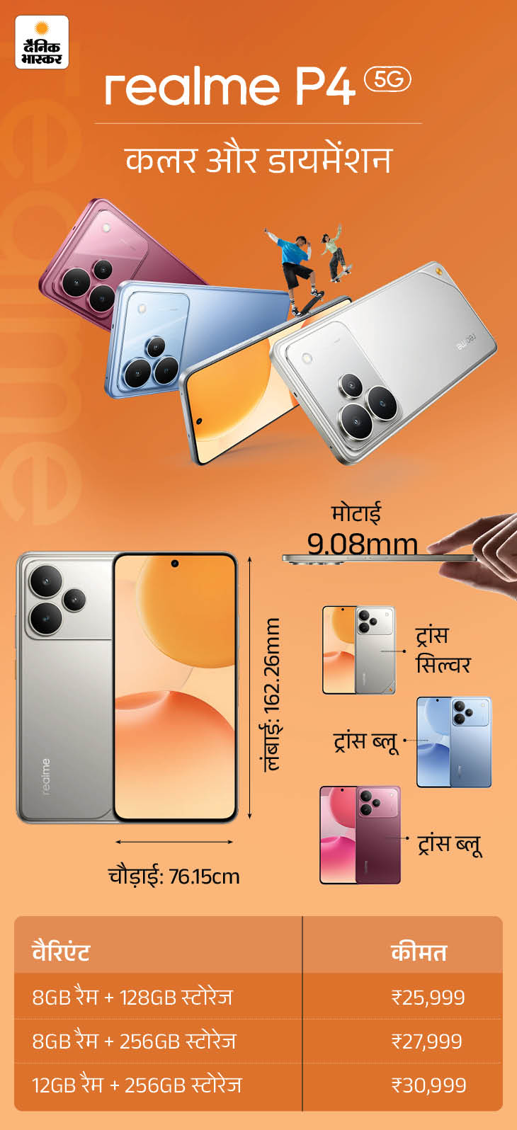 फुल चार्ज के बाद 21 घंटे तक चलने वाले मोबाइल में 50 मेगापिक्सल कैमरा और 144Hz रिफ्रेश रेट वाली टच स्क्रीन मिलेगी। रियलमी P4 पावर को दो वैरिएंट में पेश किया गया है। इसकी शुरुआती कीमत 25,999 रुपए है। फोन की सेल 5 फरवरी से शुरू होगी और लॉन्च ऑफर में 2,000 रुपए का डिस्काउंट भी मिलेगा।