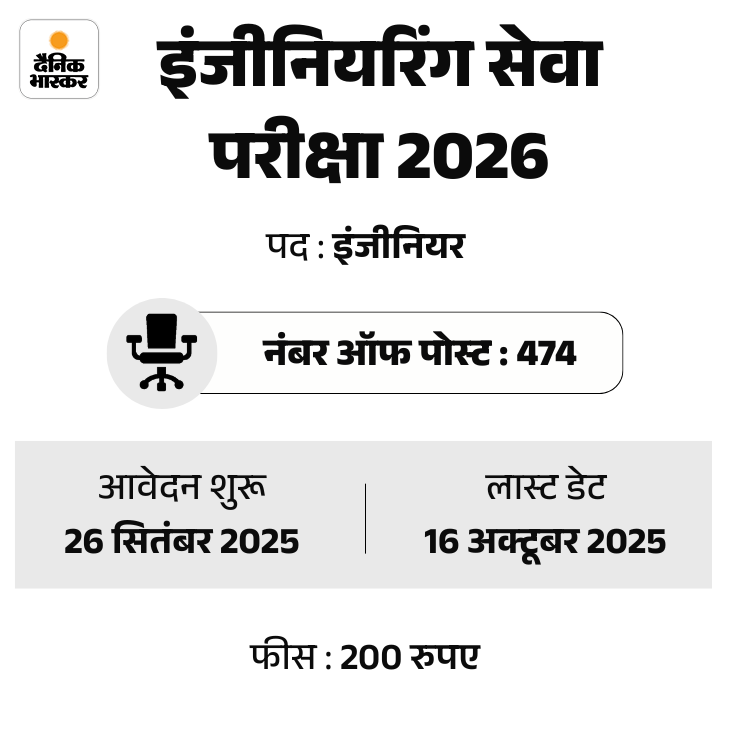 संघ लोक सेवा आयोग ने इंजीनियरिंग सर्विस परीक्षा 2026 के लिए भर्ती नोटिफिकेशन जारी कर दिया है। इस भर्ती के लिए आवेदन प्रक्रिया शुरू हो गई है। उम्मीदवार UPSC की ऑफिशियल वेबसाइट upsconline.nic.in पर जाकर आवेदन कर सकते हैं।