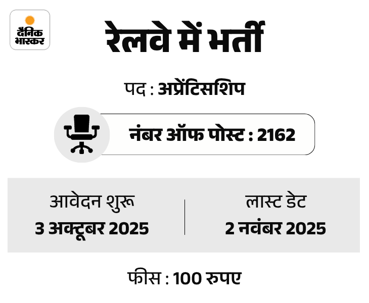 रेलवे रिक्रूटमेंट सेल (RRC) की ओर से नॉर्थ वेस्टर्न रेलवे में अप्रेंटिसशिप के 2162 पदों पर भर्ती का नोटिफिकेशन जारी हुआ है। इस भर्ती के लिए आवेदन प्रक्रिया 3 अक्टूबर से शुरू होगी। उम्मीदवार ऑनलाइन माध्यम से RRC जयपुर की ऑफिशियल वेबसाइट rrcjaipur.in पर जाकर अप्लाई कर सकेंगे। यह भर्ती अजमेर, बीकानेर, जयपुर और जोधपुर के लिए की जाएगी।